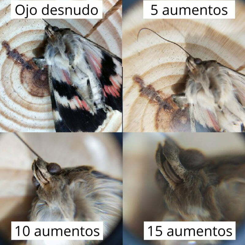 Esta triple lupa tiene 3 lentes de 5 aumentos cada una. Al superponer dos lentes obtenemos 10 aumentos, y 15 aumentos con las tres lentes.